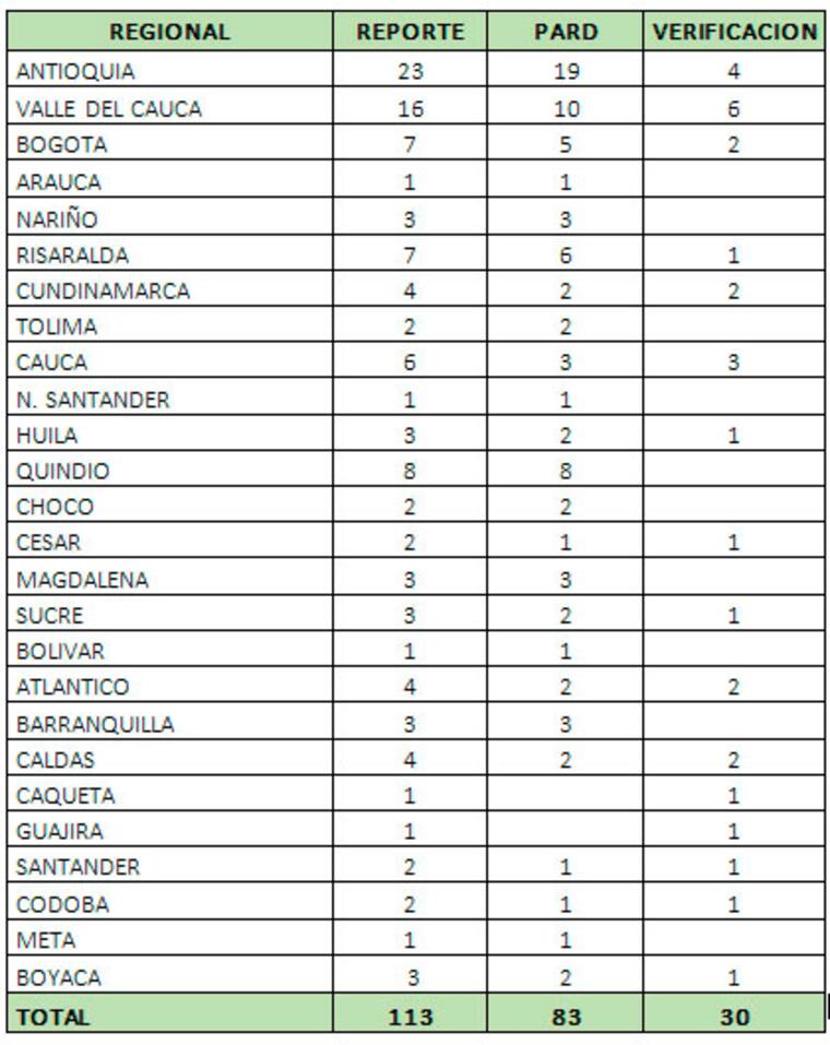 Las cifras más altas se concentraron en Antioquia, con el 20.3% del total y Valle del Cauca con el 14.1%. En un segundo grupo se ubican Quindío (7%), Risaralda y Bogotá (6%) y Cauca (5.3%). Otros 20 departamentos registran casos aunque en menores proporciones.-