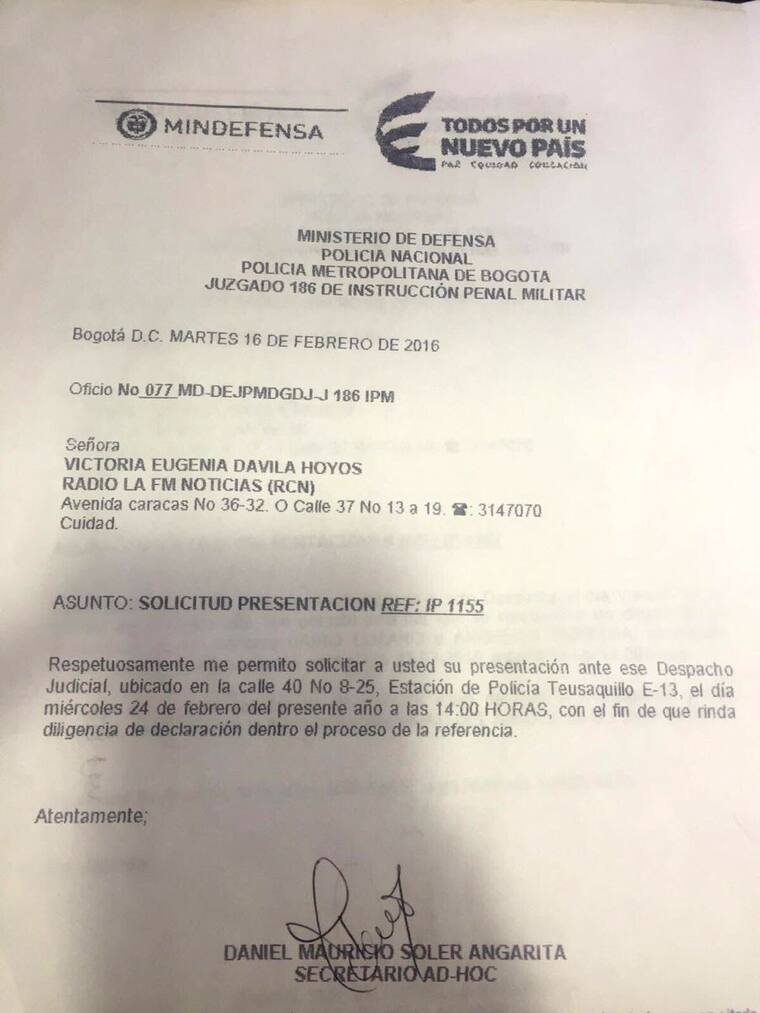 La citación fue emitida por el Juzgado 186 de instrucción penal militar. Este es el documento que publicó la periodista en su red social.