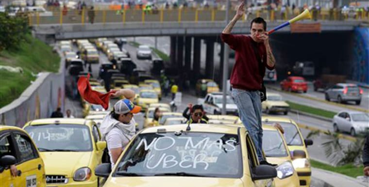 Centenares de taxistas bloqueaban el lunes diferentes puntos de Bogotá en rechazo a la aplicación Uber, a la que consideran una competencia desleal e ilegal.