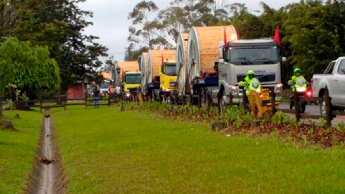 Los carretes serán transportados por tierra en vehículos especializados, ya salieron de Rionegro hacia Guatapé en cuatro camas bajas, cada uno con dos carretes de cable.