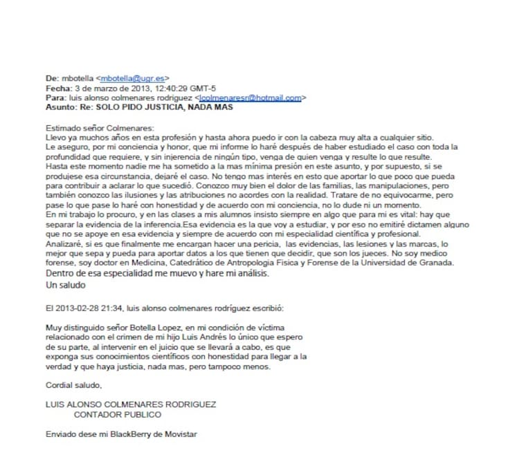 En medio de la instancia en la que la Fiscalía y las victimas cuestionan la experticia del antropólogo español Miguel Cecilio Botella López para declarar en el juicio que por la muerte de Luis Andrés Colmenares Escobar se adelanta en contra de Laura Moreno y Jessy Quintero, EL HERALDO obtuvo una copia de la comunicación que en 2013 sostuvieron el padre del estudiante y el académico español. En ella, Botella le expresa a su interlocutor que actuará con honestidad, pero afirma que no es médico forense.