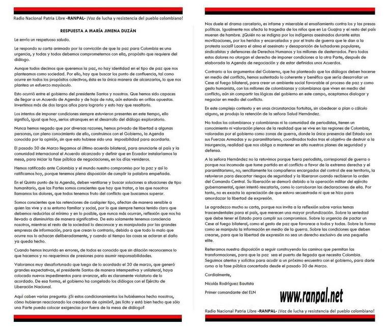 Nicolás Rodríguez Bautista, alias Gabino, jefe del ELN, respondió a una columna de la periodista María Jimena Duzán en la revista en Semana. En el texto cuestionó al ELN por el secuestro de la también periodista Salud Hernández-Mora y les dijo que la única forma de salvar el proceso de paz con el Gobierno, es que la guerrilla renuncie para siempre al secuestro.