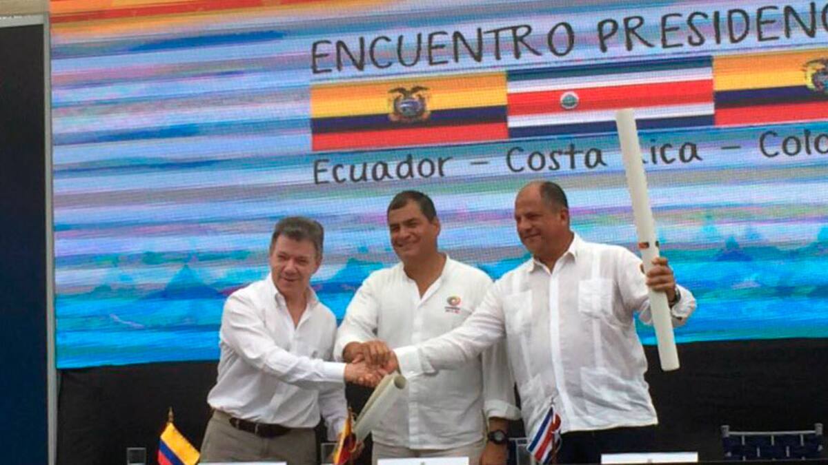Hoy se celebra 'la amistad, respeto y espíritu de colaboración de los tres países', dijo Solís, en tanto que Santos señaló que 'países con límites definidos pueden trabajar juntos sin temas de discusión'.