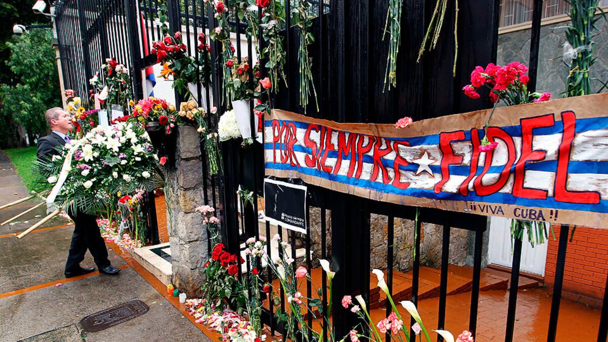 Para recibir las condolencia se habilitó el salón de recepciones de la embajada donde el libro está flanqueado por dos fotografías en blanco y negro de Castro con su uniforme militar.