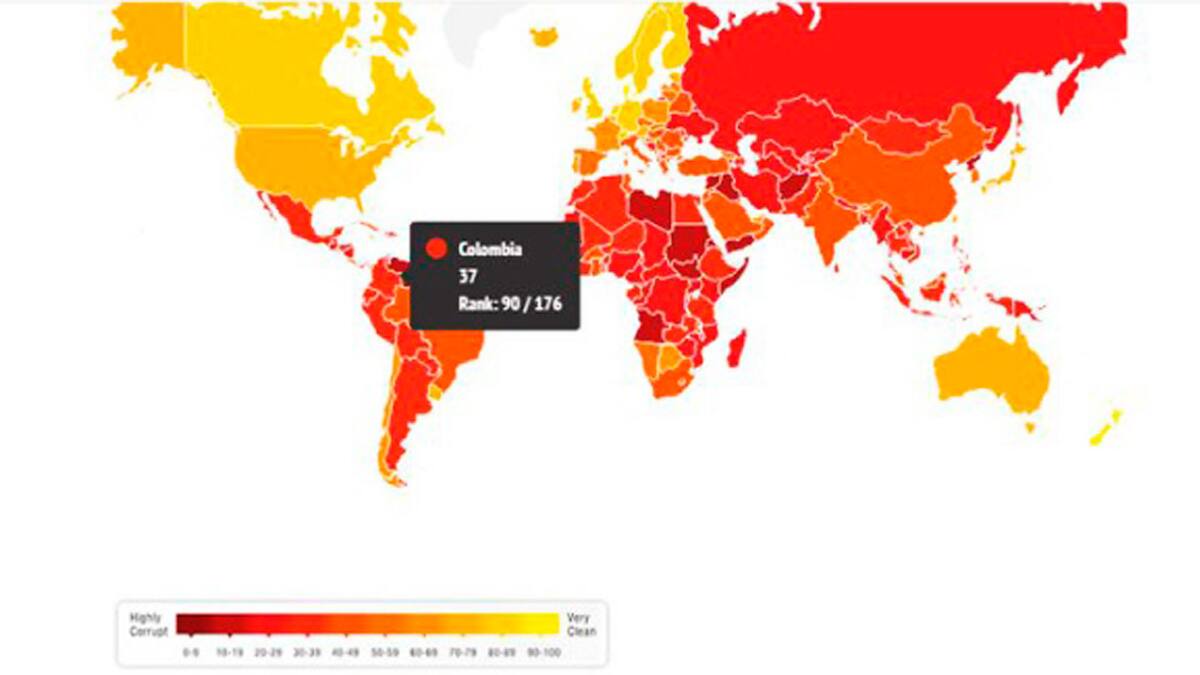 Colombia tiene un puntaje de 37 unidades y se ubica en la posición 90 sobre 176, manteniendo la misma puntuación desde 2014, cuando subió un punto comparado al 2013.
