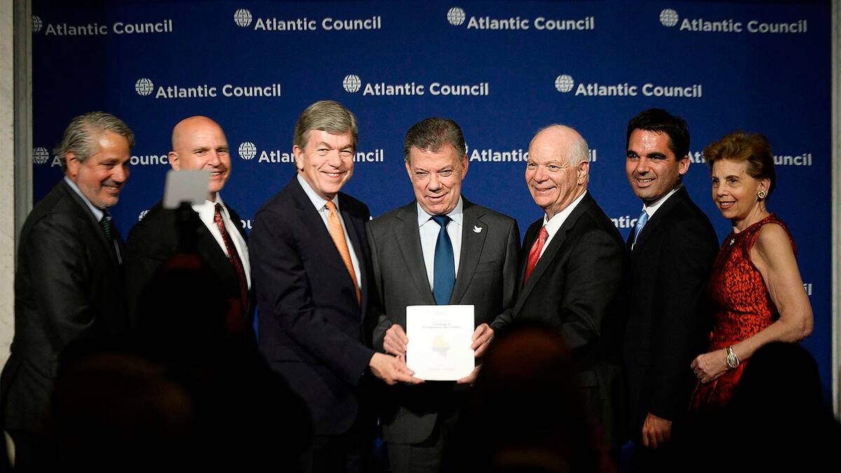 En una cena de gala en la Biblioteca del Congreso estadounidense, Santos cerró la presentación de un estudio elaborado por el Grupo de Trabajo sobre Paz y Prosperidad de Colombia del centro de estudios Atlantic Council y copresidido por los senadores estadounidenses Roy Blunt (republicano) y Ben Cardin (demócrata).