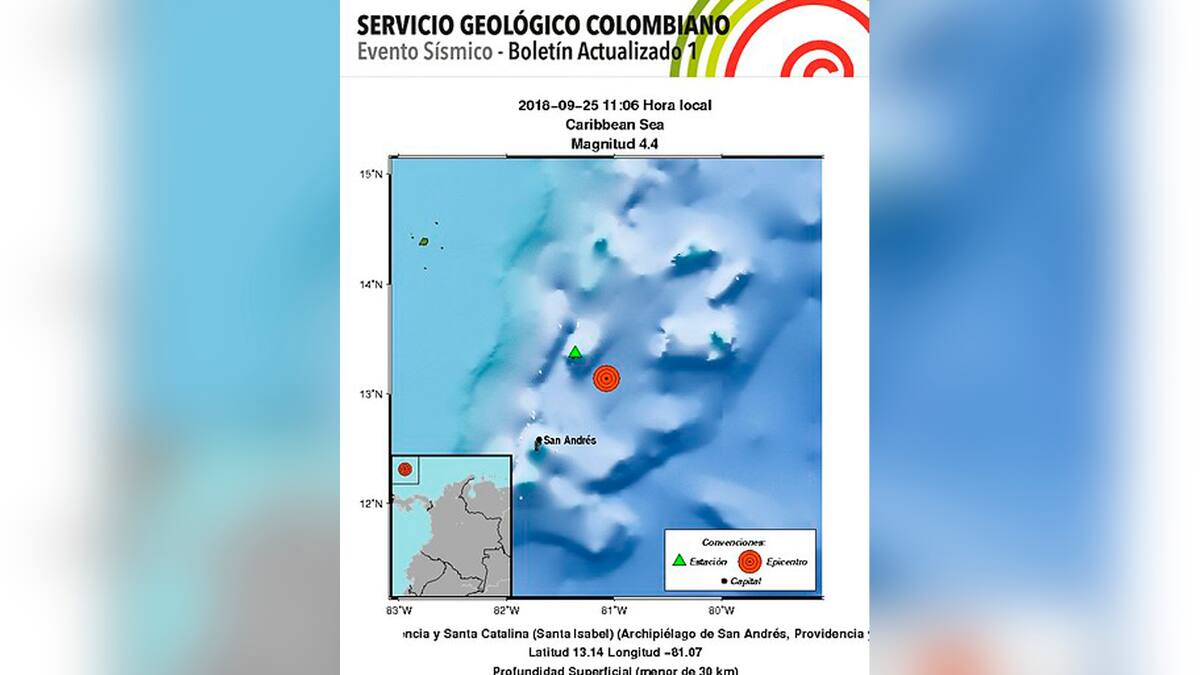 El Servicio Geológico colombiano reportó que a las 10:37 de la mañana de este martes en el mar Caribe, muy cerca al Archipiélago de San Andrés y Providencia, se sintió un sismo de magnitud 4.4 en la escala de Richter.