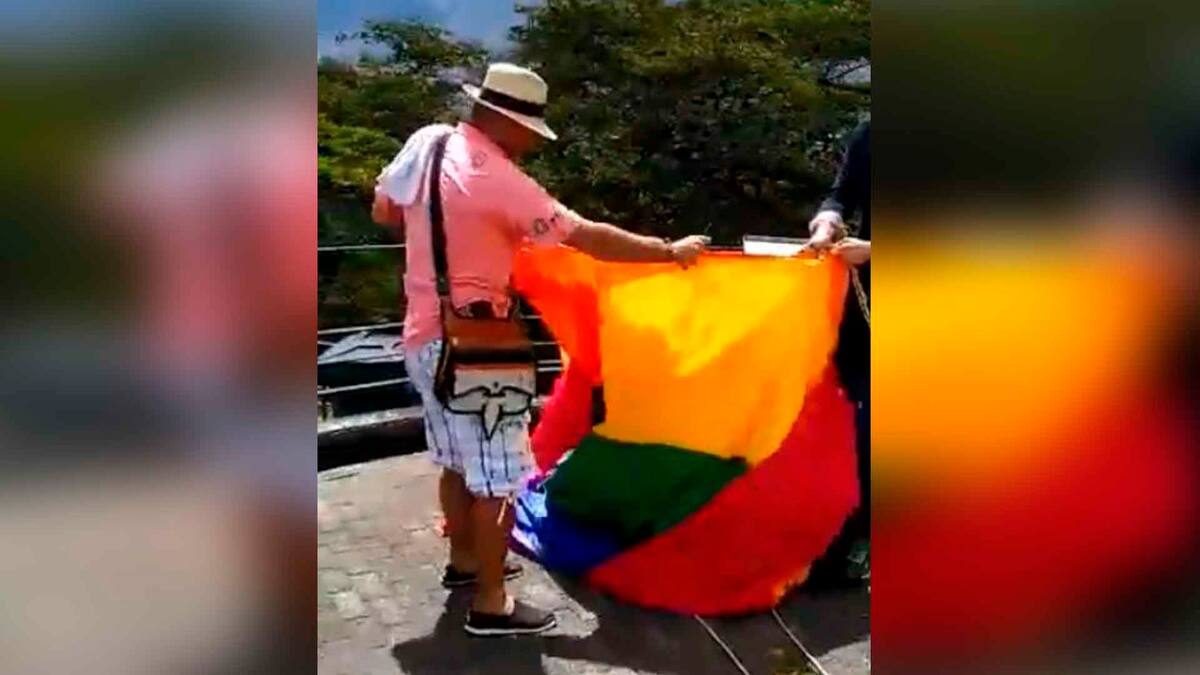 El presunto agresor, que llevaba pantalones cortos, sombrero y un bolso de cuero típico de esta región del noroeste de Colombia, cortó con una navaja los cordeles que sostenían la bandera. Ya en el suelo, otro hombre vestido de negro la llevó hasta un bote basura.