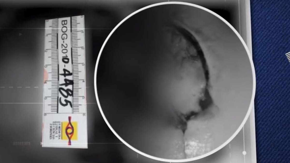 La prueba la dio a conocer el programa televisivo '4 Caminos', del 'Canal RCN', y en ella se lee el informe de Angulo: 'Hay una herida en la región supraciliar derecha. Es una fractura en esta región que tiene una forma muy característica, es una forma ovalada de la herida. Las heridas se producen de conformidad con el elemento que hace la herida. (...) Esta herida ovalada corresponde a un elemento ovalado. En este caso, podríamos decir que se asemeja al borde posterior de una botella'.