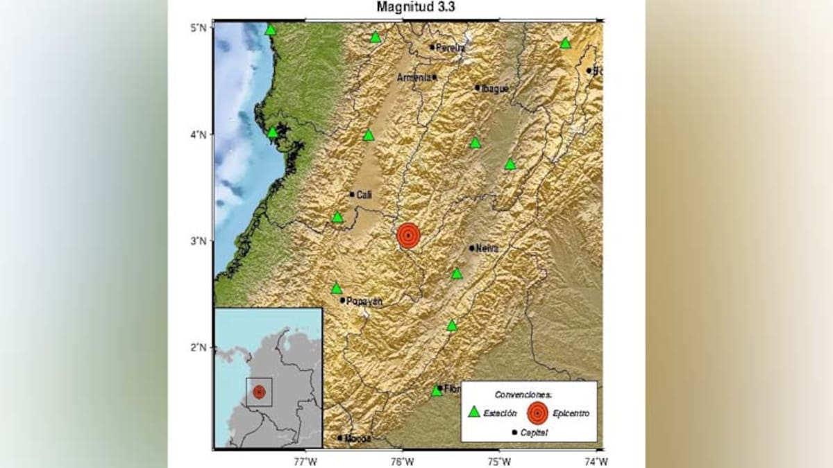 El Servicio Geológico Colombiano (SGC), a través de su cuenta en Twitter, detalló que el movimiento telúrico se registró a las 04:34 de la mañana y tuvo una profundidad de 9 kilómetros, en el área de influencia del Volcán Nevado del Huila.