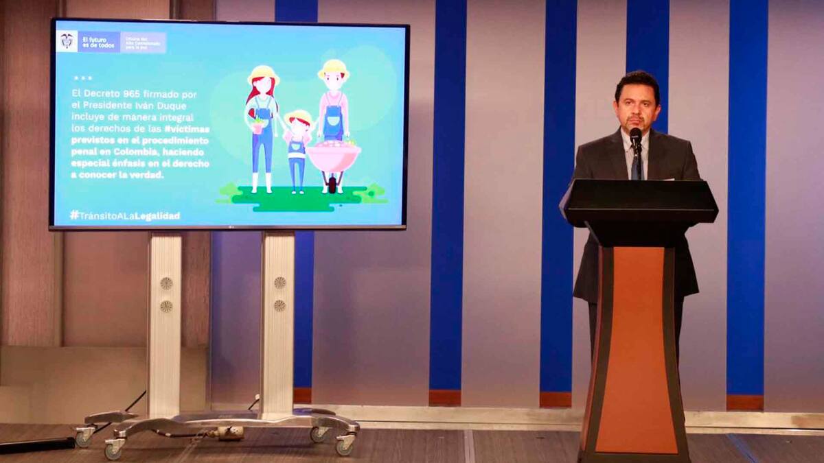 El comisionado de paz, Miguel Ceballos, informó este miércoles en rueda de prensa que el Gobierno Nacional emitió el Decreto 965 del 7 de julio de 2020, que crea una nueva ruta de sometimiento Individual a la Justicia de integrantes de Grupos Armados Organizados (GAO).