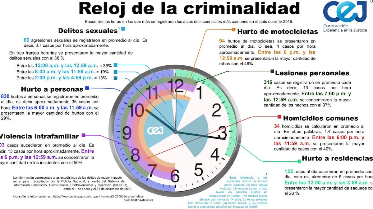 La Corporación Excelencia en la Justicia publicó el pasado lunes un informe denominado el 'Reloj de la Criminalidad', resultado del análisis de los días y las horas en que fueron cometidos los delitos en el país el año pasado.