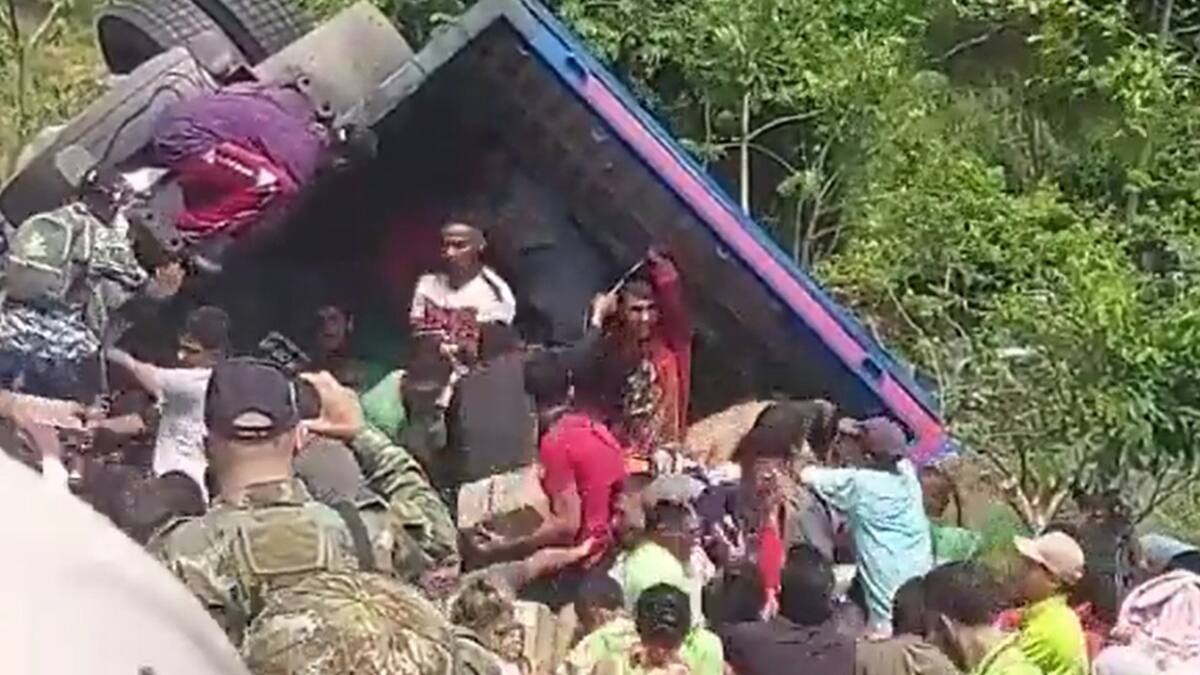 Un camión de encomiendas de la empresa Saferbo, que se volcó tras un accidente, fue saqueado por habitantes de Valdivia, Antioquia.