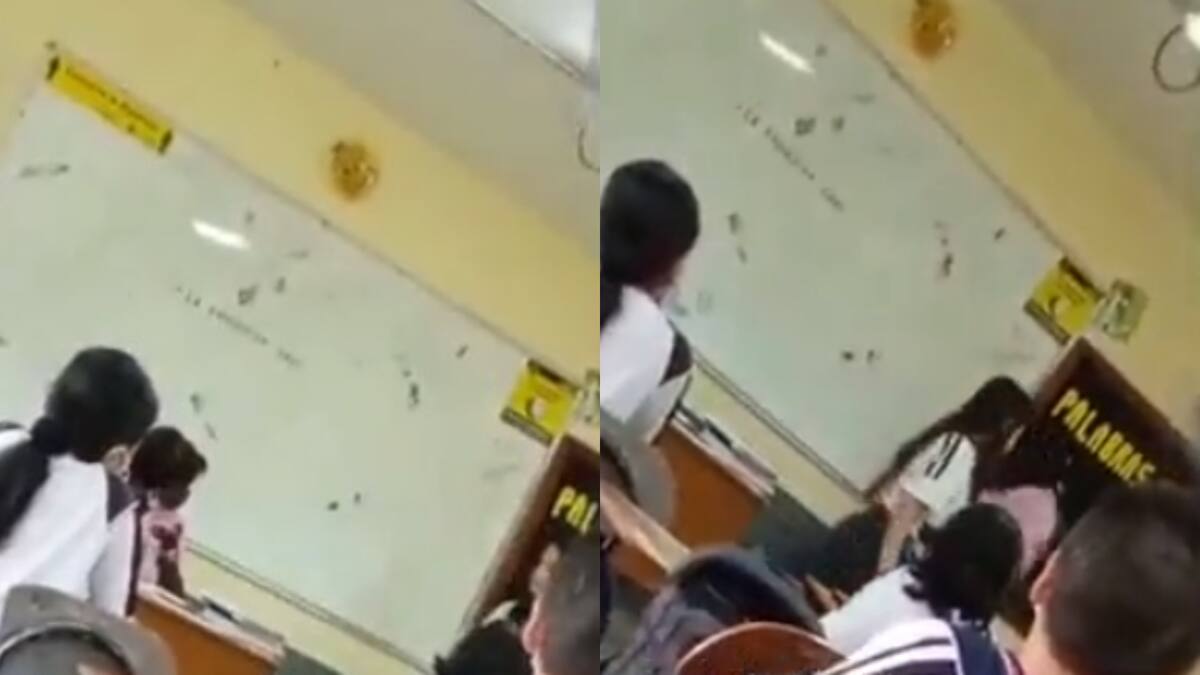 En la acción, que fue captada en video por un compañero de la menor que cometió la agresión, se observa a la estudiante cerca al escritorio de la docente, quien haría una anotación en la hoja de vida estudiantil de la joven, cuando de la nada saca un huevo y lo reviente en la cabeza de la profesora.