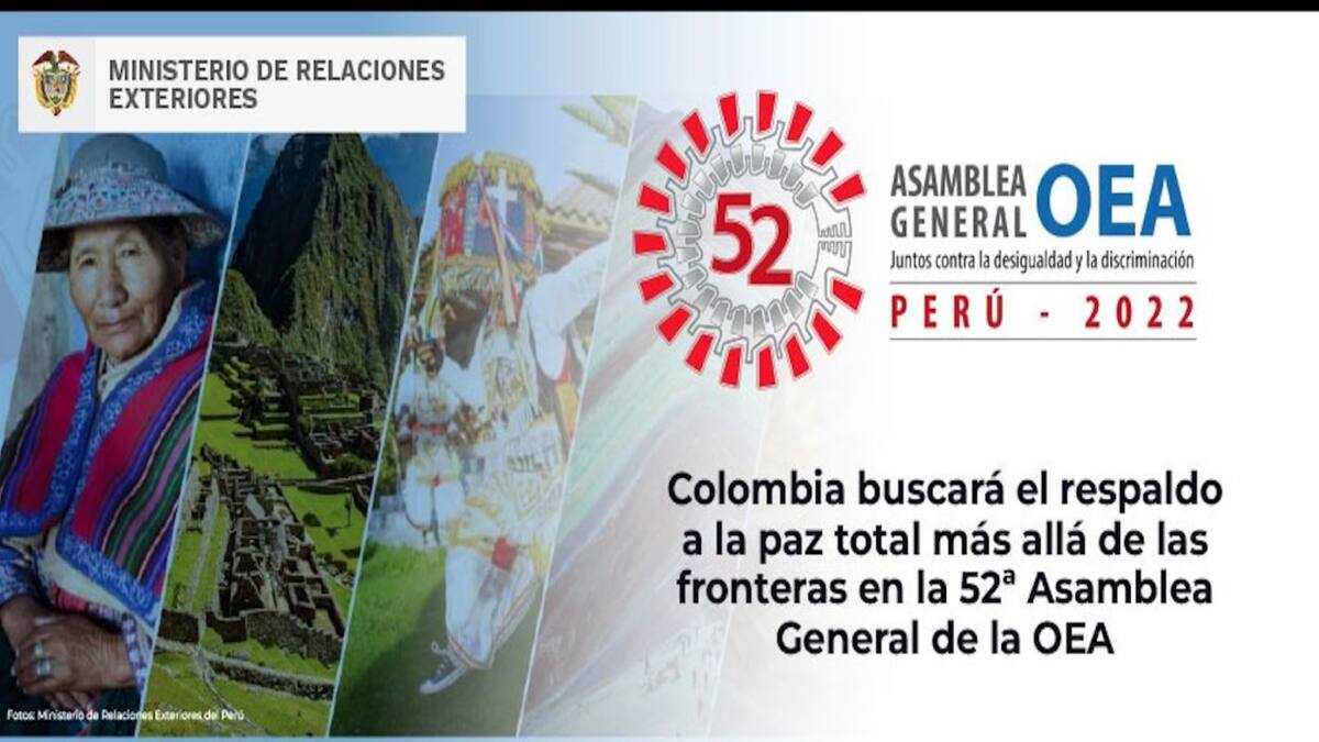 El objetivo es obtener el apoyo por parte de los países miembros a la paz total en Colombia. El Canciller arribará el jueves, 6 de octubre, para intervenir en la sesión plenaria, en donde se discutirá el tema central de la Asamblea: 'juntos contra la desigualdad y la discriminación'.