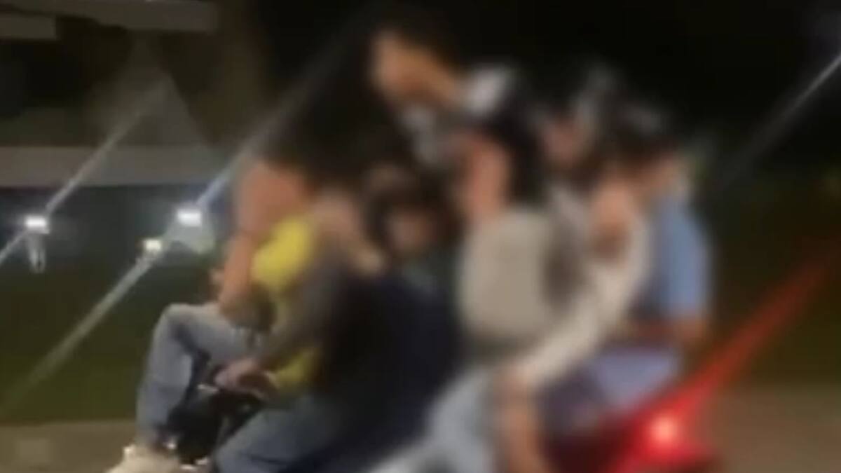 El momento fue captado por una ciudadana el pasado lunes. En las imágenes se observa a los jóvenes muy pegados, uno está sobre el manubrio del vehículo y otro de pie mientras el conductor intenta mantener el equilibrio.
