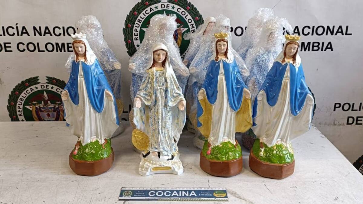 En la mañana de este martes 1 de agosto la Policía Antinarcóticos detectó más de dos kilos y medio de cocaína ocultos en 11 figuras de yeso de la Virgen María que se encontraban en la zona de carga del Aeropuerto Internacional El Dorado de Bogotá.