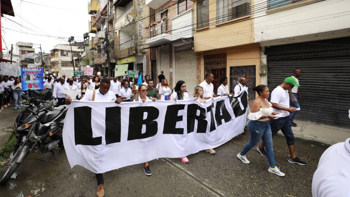 Habitantes de Quibdó y funcionarios de la Registraduría Nacional se manifestaron este jueves en las calles de esa ciudad para exigir la liberación de dos funcionarios públicos secuestrados la semana pasada.