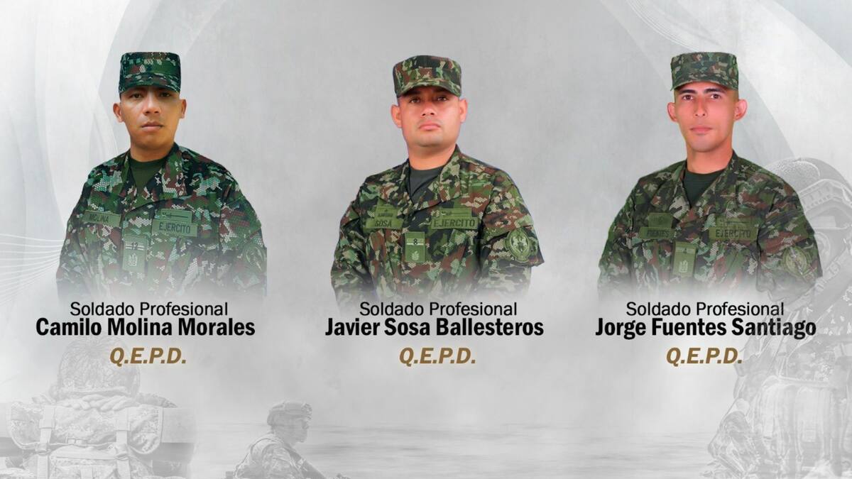 De acuerdo con el informe oficial, se trata de los soldados profesionales Jorge David Fuentes, oriundo de Valledupar, César; Javier Sosa Ballesteros, procedente de La Mesa, Cundinamarca, y Camilo Andrés Molina, de Galeras, Sucre.