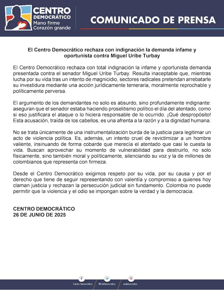 El partido Centro Democrático, al que pertenece el senador, emitió un comunicado en el que rechazó de manera tajante la acción judicial y cuestionó el argumento central de la misma, que sugiere que Uribe Turbay habría infringido el régimen de inhabilidades al participar en actos proselitistas el día del atentado.