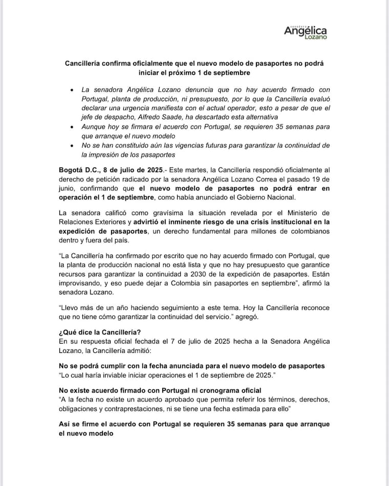 “La Cancillería ha confirmado por escrito que no hay acuerdo firmado con Portugal, que la planta de producción nacional no está lista y que no hay presupuesto que garantice recursos para garantizar la continuidad a 2030 de la expedición de pasaportes. Están improvisando, y eso puede dejar a Colombia sin pasaportes en septiembre”, afirmó la senadora Lozano.