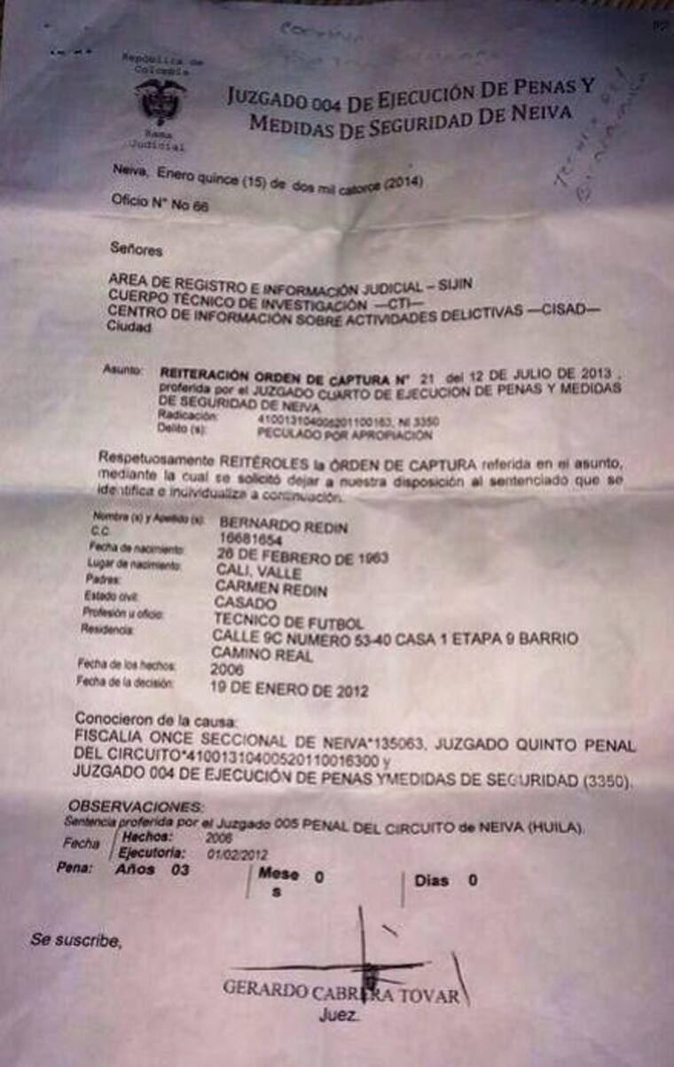 Bernardo Redín, exjugador de la Selección Colombia y actual técnico del Atlético Bucaramanga fue detenido en horas de la mañana de este viernes por dos hombres del CTI, por peculado por apropiación.