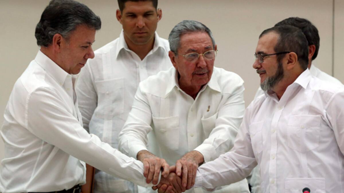 El mandatario colombiano participó hoy junto con el máximo líder de las Farc, Rodrigo Londoño Echeverri, alias 'Timochenko', en un acto en el que los equipos de paz al completo anunciaron el acuerdo sobre justicia transicional.