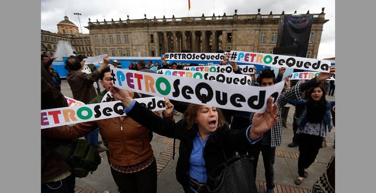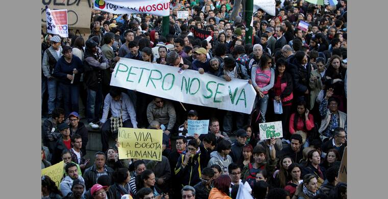 Miles de simpatizantes del alcalde de Bogotá, Gustavo Petro, se manifiestan contra la destitución del mandatario este lunes en la Plaza de Bolívar de la capital. Petro, destituido hoy del cargo por supuesta mala gestión e inhabilitado para ejercer cargos públicos por quince años, dijo que fue víctima de "un golpe de Estado" por sus políticas progresistas.