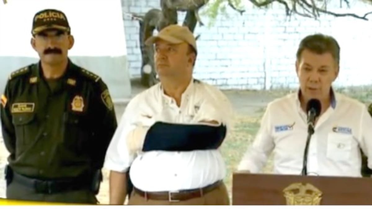 Santos ofreció una rueda de prensa acompañado del director de la Policía, Rodolfo Palomino, el ministro de Defensa, Luis Carlos Villegas, y el comandante de las FF.MM., general Juan Pablo Rodríguez.