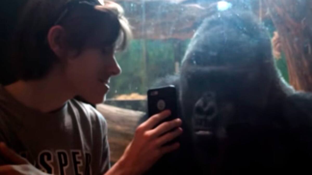 Jelani, un gorila en el Zoológico de Louisville, fue captado por un productor de televisión cuando un visitante le mostraba fotos. Lo curioso, según el creador de video, era que el gorila movía el dedo en señal como diciendo que le siguieran mostrando más imágenes de animales.