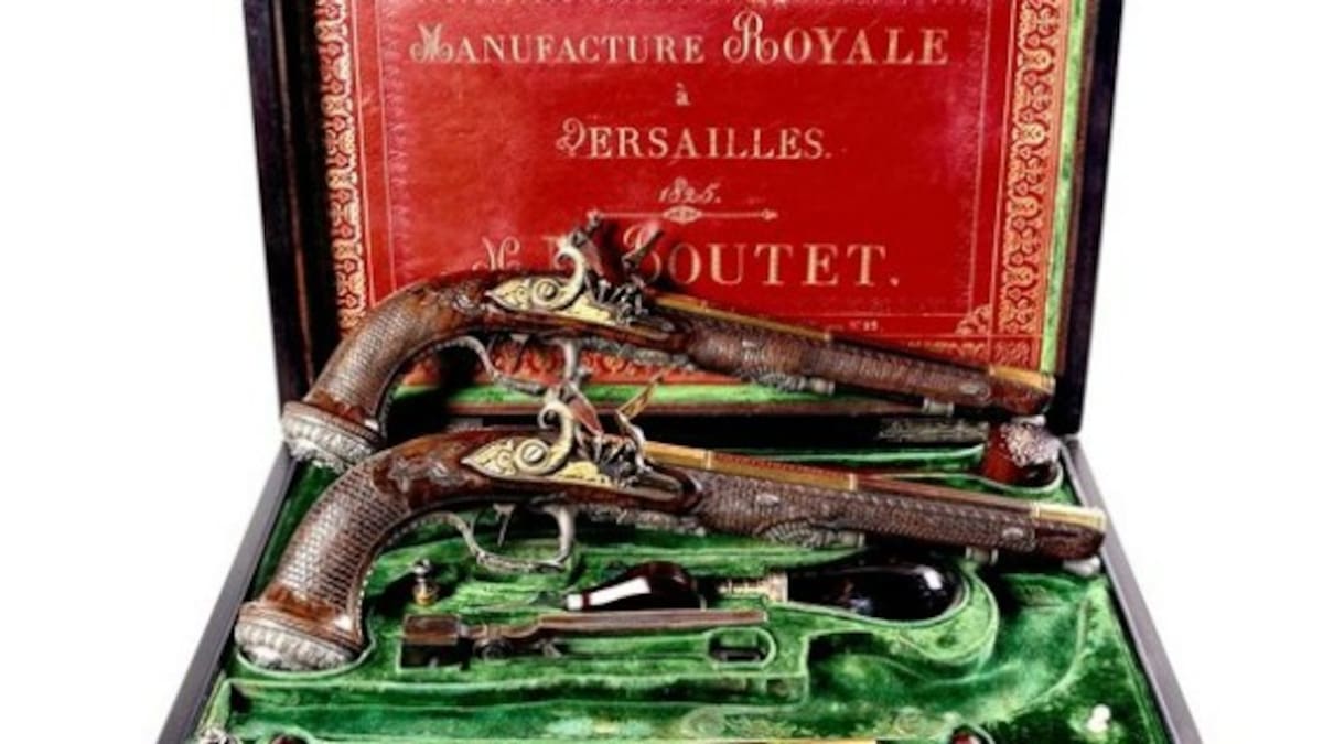 La casa de subastas Christie's presentó el viernes las ornamentadas armas como parte de un enorme lote de pintura y escultura clásicas.