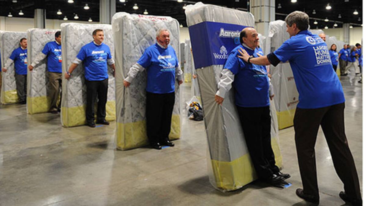 Guinness World Records difundió un video de la hazaña el jueves, donde se ven 1.200 personas sosteniendo colchones y luego dejándolos caer uno a la vez dentro de un almacén, en el condado Prince George, en Maryland, el 22 de marzo.