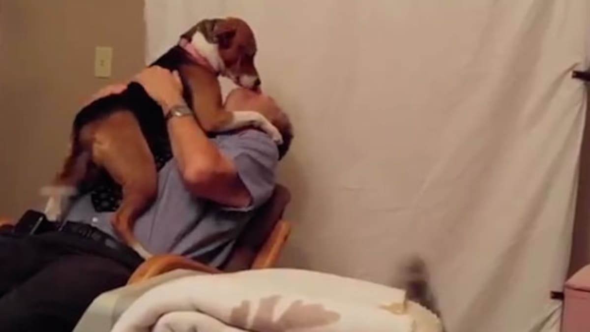 Peanut, una perrita de 1 año, fue dejada en un refugio por sus antiguos amos. 12 días después, es rescatada por una familia y al papá le muestra su agradecimiento lamiéndole la cara por casi 1 minuto.