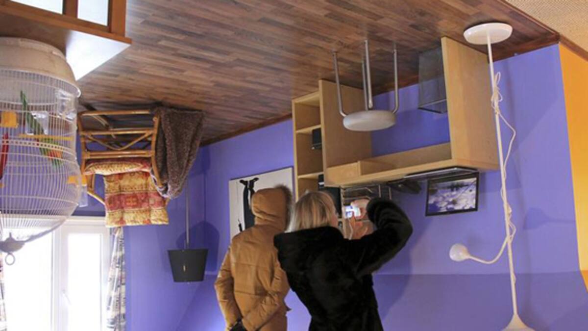 Solo con entrar por la puerta se experimenta sensación de vértigo, no tanto por el hecho de que los muebles estén pegados al techo, sino por una ligera inclinación del suelo, hecha especialmente para agudizar la ilusión.