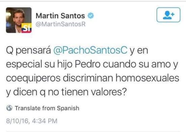 El hecho ocurre después de un par de tuits realizados por su sobrino Martín, 'Qué pensará Pacho Santos y en especial su hijo Pedro cuando su amo y coequiperos discriminan homosexuales y dicen que no tienen valores?', escribió en un primer tuit. Unos minutos después, lo borró y se explicó diciendo 'Sí. Borré tuit por respeto a Pedro que nada tiene que ver. Da piedra matoneo a minorías por intereses políticos. Procurar caer en su mismo juego'.