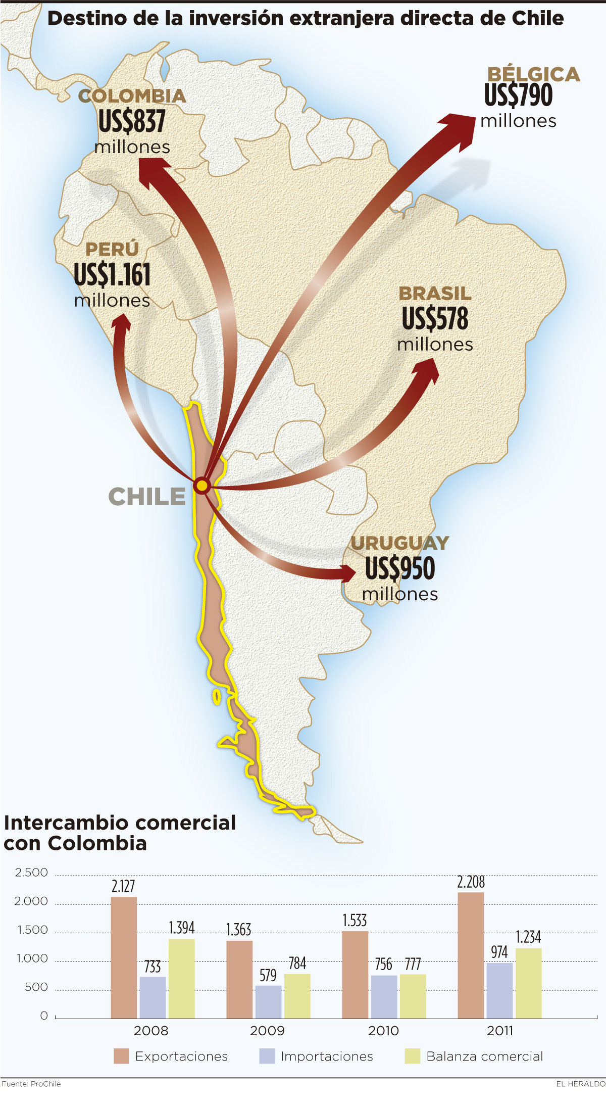 Durante el 2011 llegaron procedentes de Chile 837 millones de dólares, cifra once veces mayor a lo que invertían a principios de los noventa en el país. Debido a esta dinámica el capital chileno en Colombia suma más de 8.900 millones de dólares, de acuerdo con Direcon, organismo chileno de estudios de inversión.