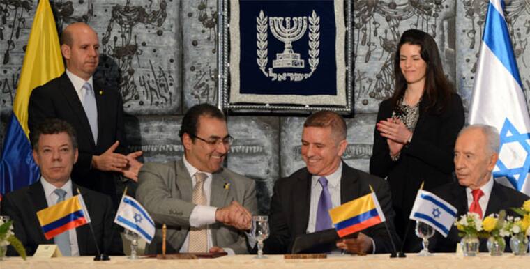 La firma de la declaración de las negociaciones, entre el ministro de Comercio colombiano, Sergio Díaz-Granados, y el de Economía y Comercio israelí, Naftalí Bennet, tuvo lugar en una ceremonia en la residencia oficial del presidente Simón Peres, que ayer recibió, con todos los honores, presidente de Colombia, Juan Manuel Santos.