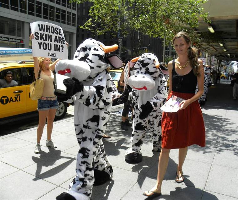 Seis integrantes de PETA llegaron hacia el mediodía en una camioneta descubierta disfrazados de vacas y haciendo sonar cencerros a las puertas del lugar, situado en pleno centro de la ciudad, muy cerca del Museo de Arte Moderno y del Radio City Music Hall.