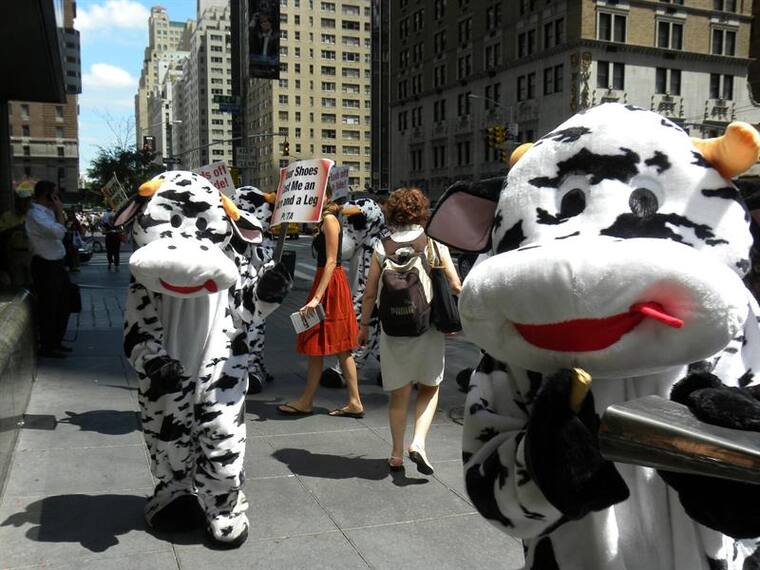 Un grupo de activistas defensores de los animales se disfrazaron hoy de vacas para protestar contra el uso de cuero en la fabricación de zapatos durante una protesta frente a la sede de la Asociación de Fabricantes de Calzado de Moda en Nueva York.