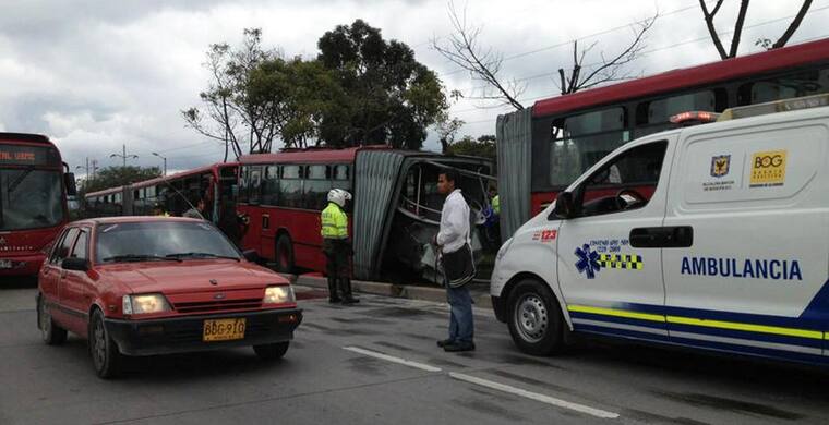 Esta mañana se presentó un accidente en la Autopista Norte de Bogotá, a la altura de la calle 134, en el que un articulado de TransMilenio chocó por detrás a otro, causando que el segundo se partiera en dos por la parte del "acordeón". Versiones indican que el accidente fue causado por un peatón imprudente, pero otras sostienen que fue por imprudencia de uno de los conductores, y otras porque intentaba esquivar un hueco. Según la secretaría de Salud, 14 personas resultaron con heridas leves. Fotos: usuarios de Twitter.