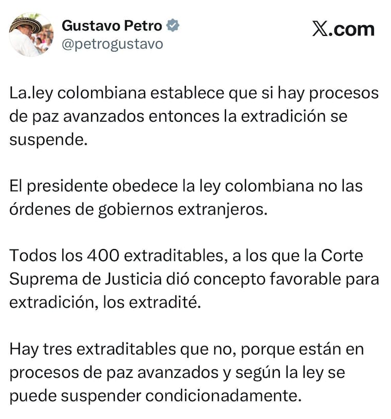 Por su parte, el presidente Gustavo Petro respondió ante la solicitud de Estados Unidos al enfatizar que actualmente “el presidente obedece la ley colombiana no las órdenes de gobiernos extranjeros. Todos los 400 extraditables, a los que la Corte Suprema de Justicia dio concepto favorable para extradición, los extradité”.