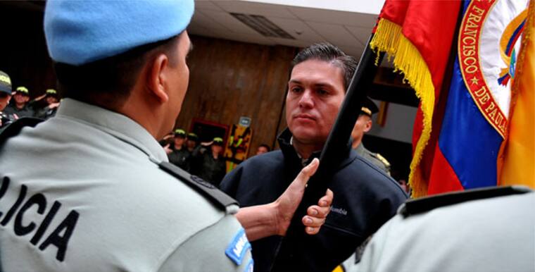 El Ministro de la Defensa Nacional, Juan Carlos Pinzón y el Director de la Policía Nacional, General José Roberto León Riaño, entregaron en ceremonia el Pabellón Nacional a 14 uniformados de la Policía que desde la próxima semana participarán en una misión humanitaria que busca el mantenimiento y estabilización de Haití.
