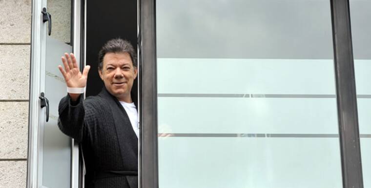 En su primera aparición pública luego de la cirugía que le practicaron el miércoles, el Presidente Santos se asomó por una ventana de la Fundación Santa Fe y saludó sonriente a los periodistas que se encuentran frente a la institución, pendientes de su estado de salud.