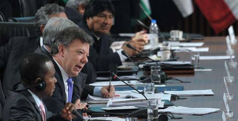 Durante su intervención en la sesión plenaria de la III Cumbre de Jefes de Estado y de Gobierno América del Sur — Países Árabes (ASPA), en Lima (Perú), el Presidente Juan Manuel Santos afirmó que Colombia seguirá apoyando en lo que sea posible para que Libia recupere su democracia y condenó los hechos violentos que se registran en Siria. También presentó ante el Aspa los diálogos de paz en Colombia.
