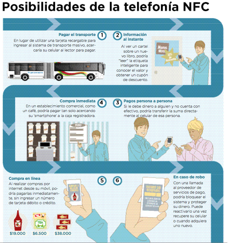 Según Daniel Cuéllar, gerente de Ventas de Telecomunicaciones de Gemalto, compañía internacional dedicada a la seguridad digital, lo interesante de NFC es que puede ser aplicada a casi todo lo que se realiza en la cotidianidad. 'NFC se convierte en una herramienta de acceso fundamental en las ciudades que le apuestan a conectarse de forma rápida y segura, permitiendo que a través de un celular o una tableta podamos pedir a domicilio y realizar rápidamente el pago, ingresar al sistema masivo de transporte, almorzar en el restaurante favorito y conseguir descuentos para el supermercado', sostiene Cuéllar.