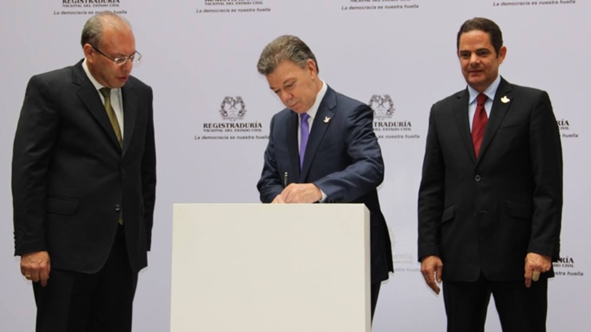 El gobernante-candidato y su compañero de fórmula para la Vicepresidencia, su exministro Germán Vargas Lleras, firmaron la inscripción ante el registrador nacional, Carlos Ariel Sánchez, máxima autoridad encargada de la logística electoral, y acompañados por sus familias, los partidos de coalición y los medios.
