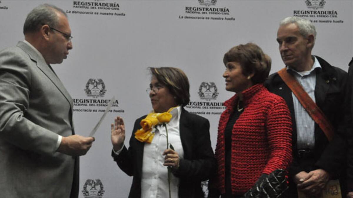 El registrador Carlos Ariel Sánchez recibió a Avella en la plazoleta, una vez concluyó una misa y procedió a inscribir a la candidata de la Unión Patriótica.