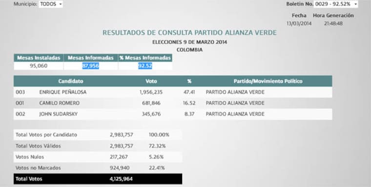 De acuerdo con la Registraduría, los resultados de las actas de escrutinio departamentales y distritales, consolidan la información en el acta general de escrutinios y el CNE declara el ganador de la consulta, por tanto la entidad no tiene bajo su competencia efectuar los escrutinios, así mismo los resultados que publica finalizada la jornada de votaciones son informativos y están basados en lo contenido en los formularios E-14 o actas de escrutinio de mesa, tarea que concluirá la próxima semana.