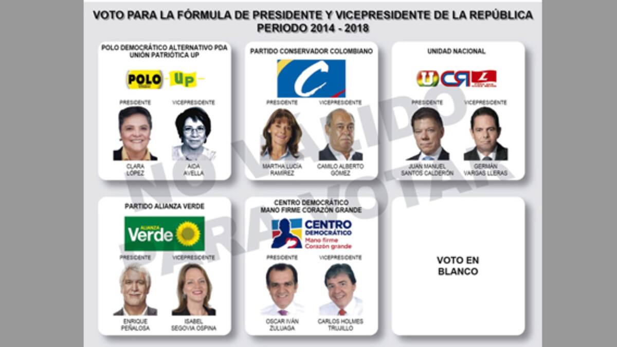 La coalición Polo Democrático y Unión Patriótica (Clara López y Aída Avella) obtuvo la primera casilla; el Partido Conservador (Martha Lucía Ramírez y Camilo Gómez) obtuvo el segundo lugar; en la tercera posición estará la coalición Unidad Nacional (Juan Manuel Santos y Germán Vargas Lleras), conformada por La U, Cambio Radical y el Partido Liberal; a la Alianza Verde le correspondió el cuatro puesto (Enrique Peñalosa e Isabel Segovia) y el grupo significativo de ciudadanos Centro Democrático (Óscar Iván Zuluaga y Carlos Holmes Trujillo) se quedó con la quinta posición en la tarjeta electoral presidencial. En último lugar aparecerá el voto en blanco.