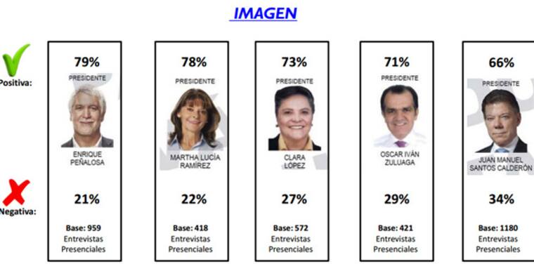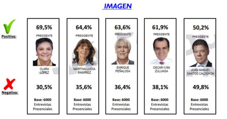 En el consolidado nacional Clara López cuenta con la imagen más positiva, con el 69,5%, seguida de Martha Lucía Ramírez, con el 64,4%, Enrique Peñalosa, con el 63.5% y Óscar Iván Zuluaga, con el 61,9%. Llama la atención las cifras de Juan Manuel Santos, que tiene una imagen positiva del 50,2% contra una imagen negativa del 49,8%.